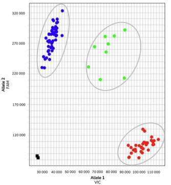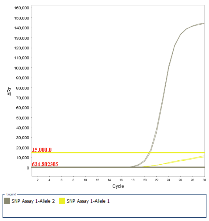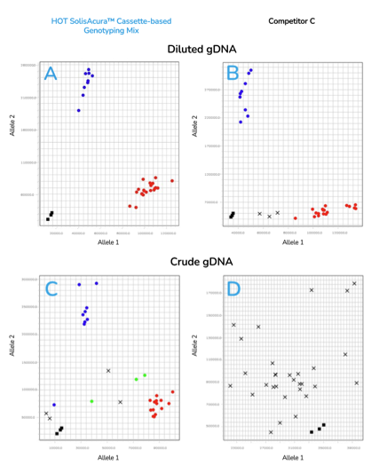 This enzyme is suitable for SNP detection via allele-specific PCR, using bi-allelic discrimination that is achieved with a universal reverse primer and two competitively binding allele-specific forward primers, each with a unique tail sequence that corresponds to either of two universal FRET cassettes. HOT SolisAcura™ Cassette-Based Genotyping Mix (ROX) is also compatible with KASP™, PACE® and Amplifluor® marker assays.