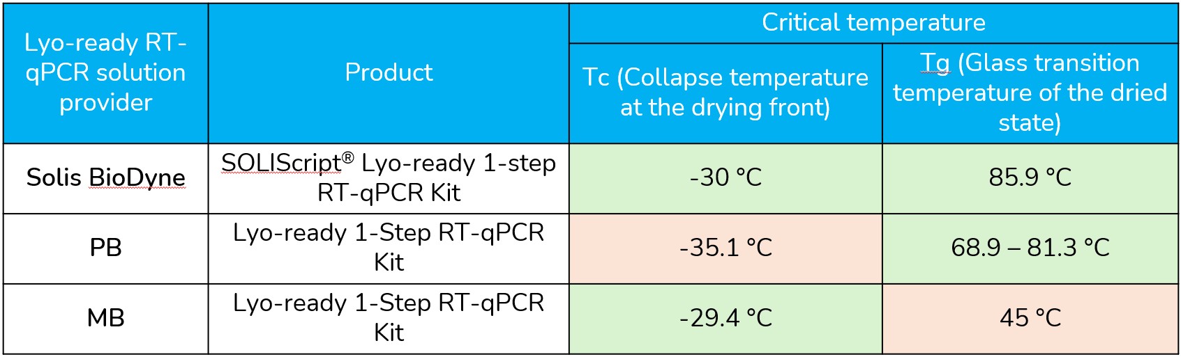 SOLIScript® Lyo-ready 1-step RT-qPCR Kit is an optimized solution for fast and sensitive amplification and quantitation of RNA and DNA targets with probe-based assays. With a high collapse temperature (Tc) of -30 ˚C, the kit allows for the adoption of a rapid and energy-efficient lyophilization protocol. With a glass transition temperature (Tg) of 85.9˚C, the lyophilizates have a high resistance against long term exposure to higher temperatures. The composition is optimized for lyophilization to cakes or beads. The kit comes in 4 tubes: 40x SOLIScript® Lyo-compatible One-Step Mix, HOT SolisFAST® Glycerol-Free DNA Polymerase (10 U/μl), 4x Lyo Reaction Buffer and 4x RT-qPCR Lyo Excipient Mix.